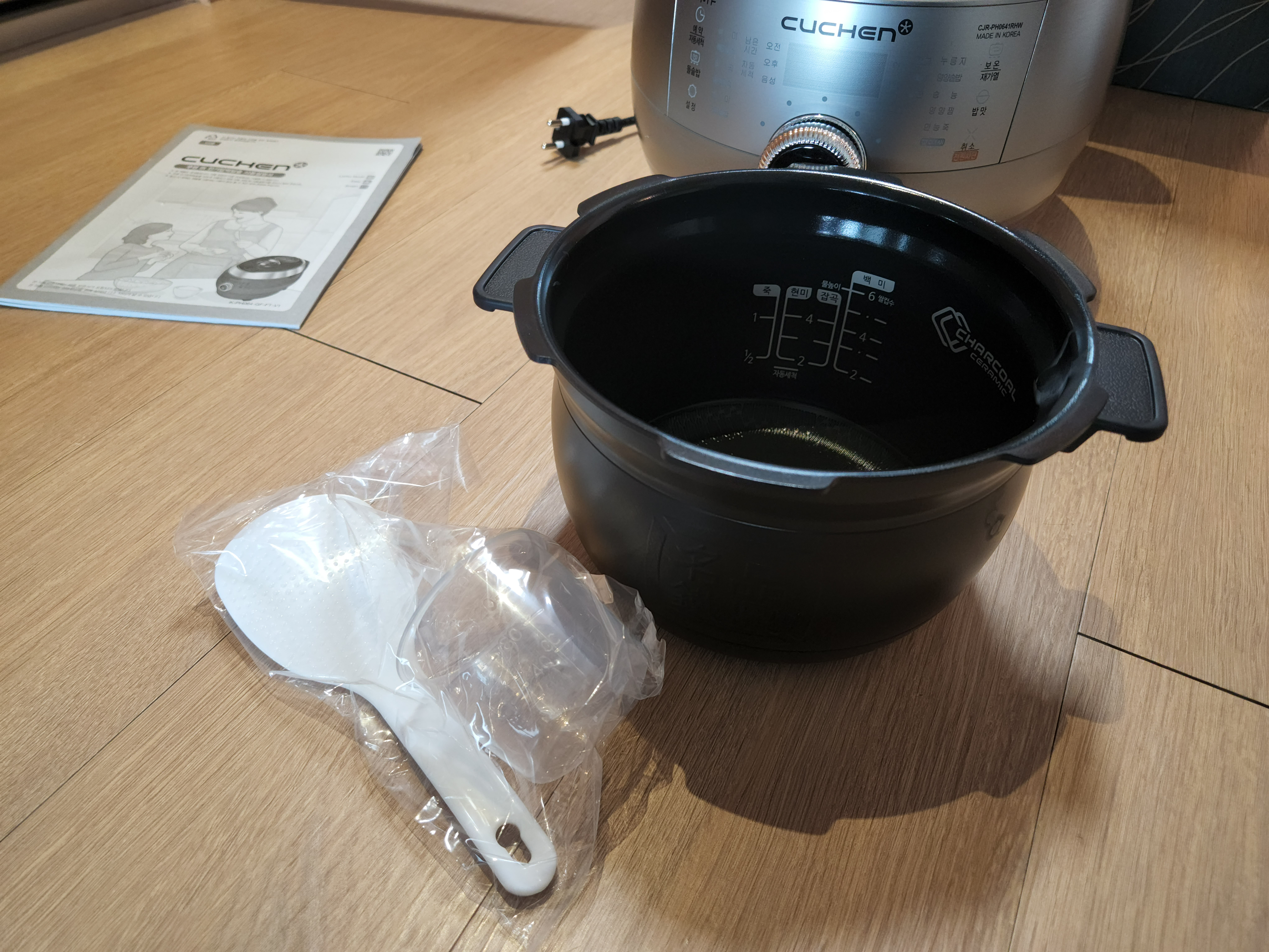 구성품은 본체, 사용설명서, 주걱, 계량컵입니다.
