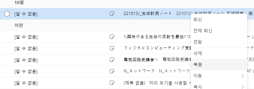 지운 편지함에 들어가면 삭제한 노트들의 목록이 보이는데요.