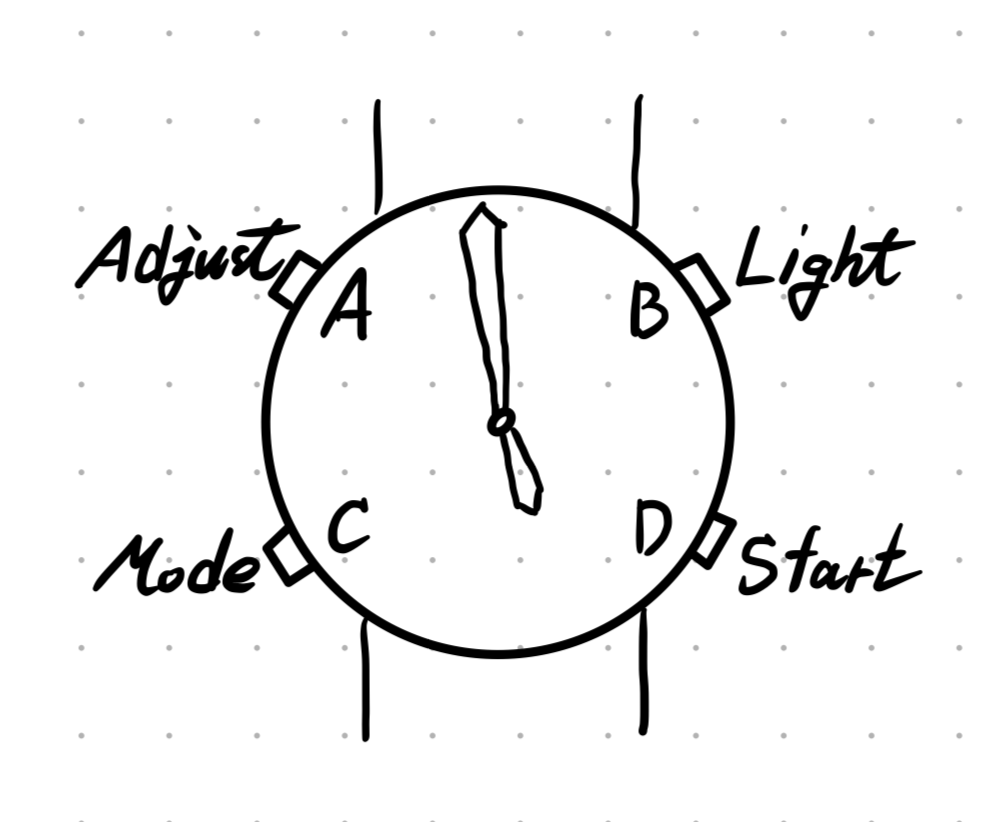 WT(World Time), ST(Stop Watch), TR(Timer), AL(Alarm), B(블루투스 연결 모드)